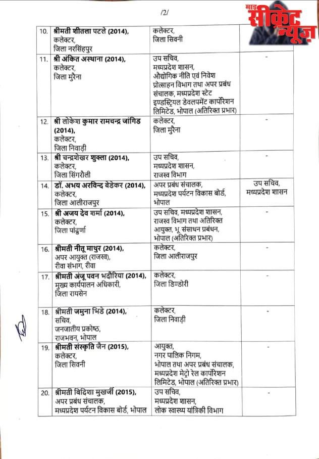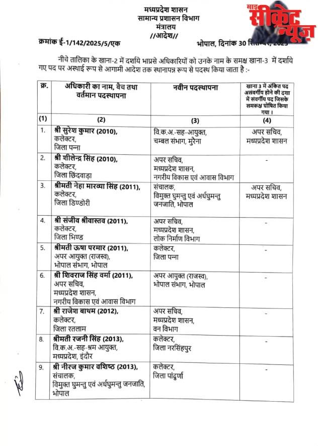 राज्य शासन द्वारा जारी आदेश में कलेक्टर पन्ना सुरेश कुमार को ओएसडी सह आयुक्त चंबल संभाग मुरैना, छिंदवाड़ा कलेक्टर शीलेंद्र सिंह को अपर सचिव नगरीय विकास और आवास विभाग, नेहा मारव्या कलेक्टर डिंडौरी को संचालक विमुक्त घुमंतू और अर्ध घुमंतु जनजाति विभाग, संजीव श्रीवास्तव कलेक्टर भिंड को अपर सचिव लोक निर्माण विभाग, उषा परमार अपर आयुक्त राजस्व भोपाल संभाग को कलेक्टर पन्ना पदस्थ