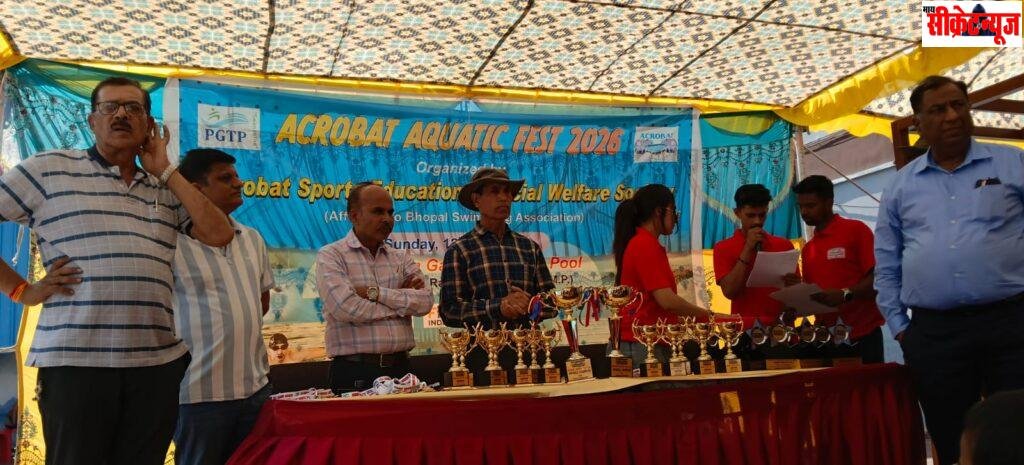 भोपाल। रायसेन रोड कल्पना नगर के कोल परिसर स्थित पुरुषोत्तम गौर स्विमिंग पूल में 12 अप्रैल को एक्रोबट एक्वाटिक फेस्ट-2026 तैराकी प्रतियोगिता का आयोजन किया गया। आयोजन की शुरुआत बच्चों के रिपोर्टिंग टाइम के साथ हुई। यह आयोजन एक्रोबट स्पोर्ट्स एजुकेशन एंड सोशल वेलफेयर सोसायटी पुरुषोत्तम गौर स्विमिंग पूल द्वारा भोपाल स्विमिंग एसोसिएशन के सहयोग से किया गया है। इसमें सभी आयु वर्ग के प्रतिभागियों के लिए विभिन्न श्रेणियों में प्रतिस्पर्धाएं आयोजित की गई। प्रतियोगिता के समापन पर कोच और समिति पदाधिकारियों ने सभी विजेता प्रतिभागी बच्चों को शील्ड-मेडल ओर प्रशस्ति पत्र देकर सम्मानित किया। इस मौके पर पूल संचालक संतोष कटियार, स्वीमिंग कोच आरडी झा, समाजसेवी उदित नारायण समेत बड़ी संख्या में आयोजन समिति के सदस्य, बच्चे और उनके अभिभावक गण मौजूद रहे।