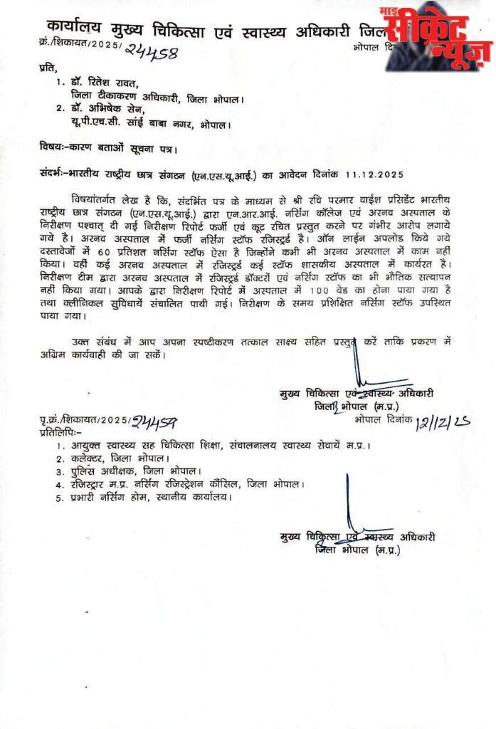 भोपाल। भोपाल के एनआरआई नर्सिंग कॉलेज एवं अरनव अस्पताल की कूटरचित एवं फर्जी निरीक्षण रिपोर्ट बनाए जाने के गंभीर मामले में स्वास्थ्य विभाग ने आरोपियों पर शिकंजा कस दिया है। मामले को संज्ञान में लेते हुए मुख्य चिकित्सा एवं स्वास्थ्य अधिकारी (सीएमएचओ) भोपाल ने निरीक्षण में लापरवाही एवं अनियमितता बरतने वाले दो अधिकारियों को कारण बताओ नोटिस जारी किया है।