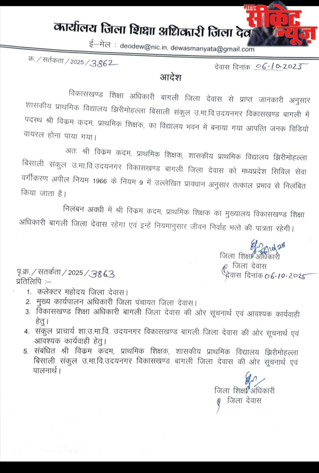 वरिष्ठ अधिकारी के निर्देश पर अखबारों में प्रकाशित खबर की जांच में आये थे व जो की पूरी खबर व वायरल वीडियो सही पाया गया जिसका प्रतिवेदन बना कर वरिष्ठ अधिकारी को भेजा गया जिस पर त्वरित कार्यवाही करते हुवे शिक्षक विक्रम कदम को तत्काल प्रभाव से निलंबित किया गया है
